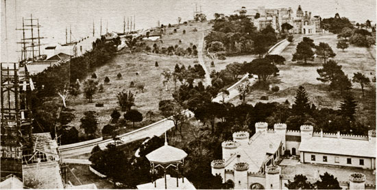Detail from Bayliss's great panorama of Sydney, looking north from the dome of the Garden Palace to Bennelong Point. On the left can be seen a Palace tower under construction; to the right Government House Stables (now the Sydney Conservatorium of Music); in the middle distance, Government House. (Private collection)