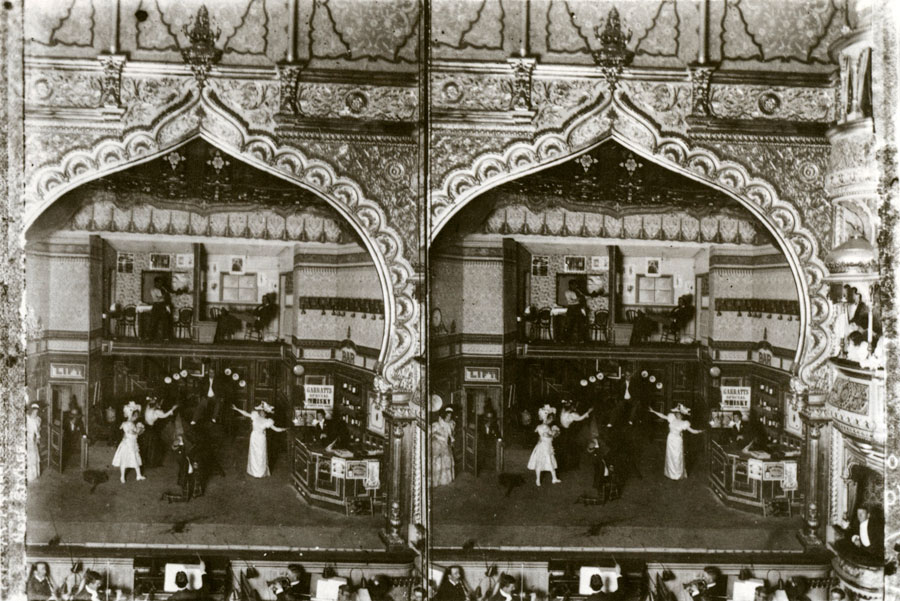 This is a stereoscopic and flashlight photograph of the play, A Bunch of Keys, at the Palace Theatre, George Street. Opened in 1896, the 'Palace' was described as being decorated in 'elaborate Indian ornamentation', an effect made possible by the embossed sheet metal manufacturers, Wunderlich Patent Ceiling and Roof Company Ltd.