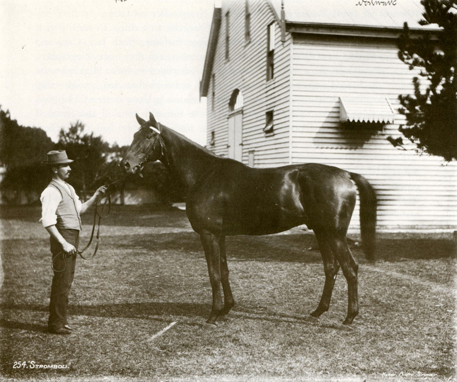 Charles Kerry was a keen horseman and he built up a large business photographing stud, show and race horses. This is Stromboli, who won the Sydney Cup in 1892 in a time of 3.35 minutes over 16 furlongs (3.2 km). Stromboli was a Bay horse bred in 1888 by Chester from Etna. Raced by J. B. Clark, he won the AJC Derby, the AJC Sires Produce Stakes and the VRC Sires Produce Stakes. His progeny were of no account on the racecourse.