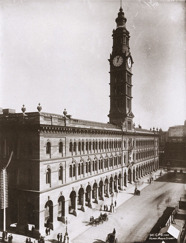 James Barnet, Government Architect, designed this building which was completed in 1887 after twenty-three years of fitful construction. The Italianate quality of the building has never been fully appreciated. The fountains intended for the front of the building were never constructed and the State Government sold the northern portion of the projected piazza to private enterprise. Their buildings turned a sunny square into a dark void. The rapid growth of telecommunications in later decades forced the clean lines of the 'palazzo' to become cluttered by the addition of attic storeys and mansard roofs for house telephone services and administration. Note the builder's hoardings, in preparation for the erection of the buildings on the northern portion of the open square between 1898 and 1901.