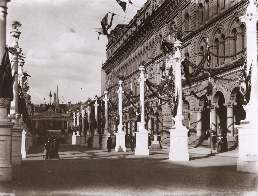 Decorated for the NSW Commonwealth celebrations of 1901. As can be seen, Martin Place did not yet extend from Phillip Street to Macquarie Street, and the spire of the now demolished St Stephen's Presbyterian Church can still be seen on the skyline, rising from its site in Phillip Street. |