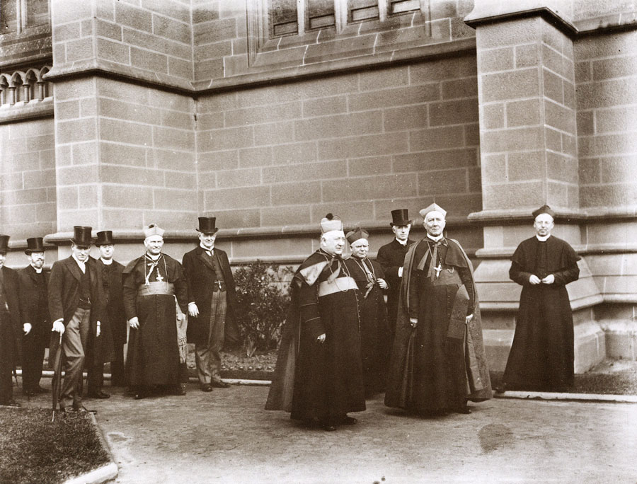 This photograph shows a group at the side of St Mary's Roman Catholic Cathedral. The occasion was a meeting prior to the Australasian Catholic Congress of September-October 1909. Pictured from the left to right arc Father Reginald Bridge (with beard), Mr T.J. Dalton (in top hat), unknown cleric, Bishop Patrick O'Connor of Armidale, Hon. John Hughes, MLC (top hat), Archbishop Thomas Carr of Melbourne, Bishop J. Gallagher of Goulburn, Monsignor O'Brien, Rector of St John's, University of Sydney (top hat), Cardinal Moran and Monsignor Denis O'Haran. |