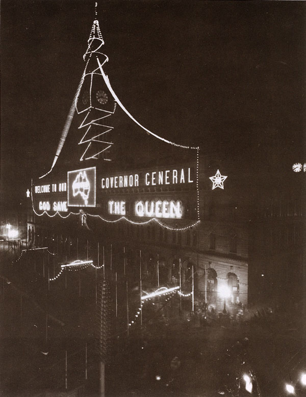 Covered with electric lights, the first time such a spectacular technique had been used in Sydney, the GPO spells out the city's welcome to John Lewis Hope, Earl of Hopetoun, Australia's first Governor-General. Hope, who arrived in Sydney on 15 December 1900, had once been a very popular Governor of Victoria.
