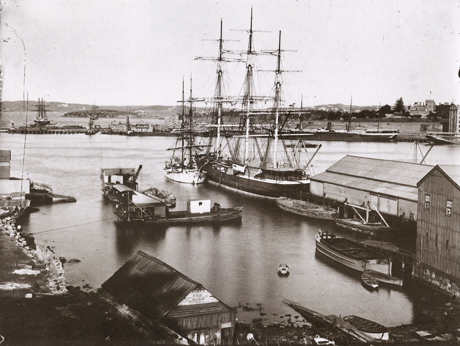 This view across the Cove, from B. Macbeth's boatbuilding yard, shows Fort Macquarie, on Bennelong Point, and two men-of-war in Farm Cove. |