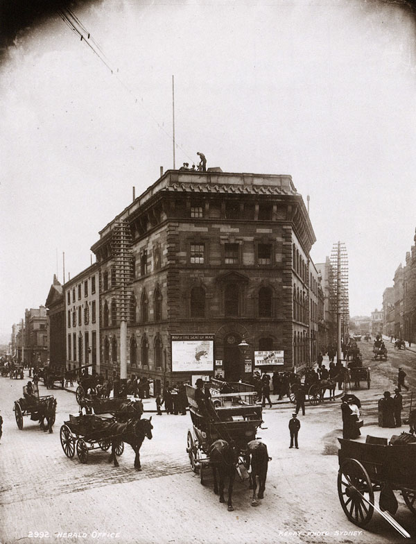 Kerry took this photograph in January 1901 after Australian troopers had left for South Africa. Looking at it through a magnifying glass, one can see the public jostling to look at photographs of the embarkation at Circular Quay, posters proclaiming the latest news from Lady-smith, and a large map showing, by coloured markers, the slow advance of the Imperial troops into the Transvaal. The Herald's office was at 38 Hunter Street.