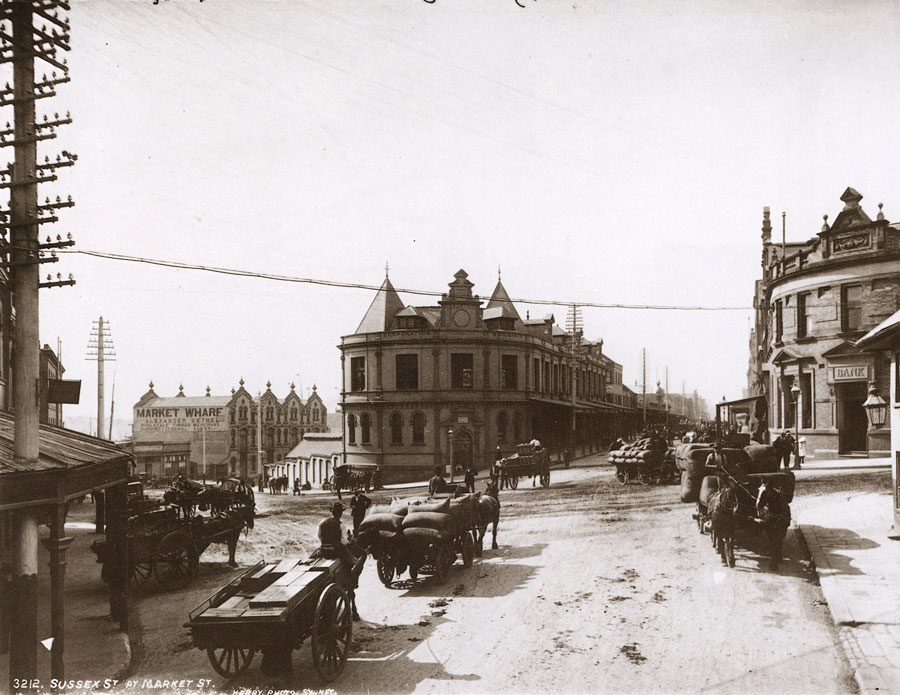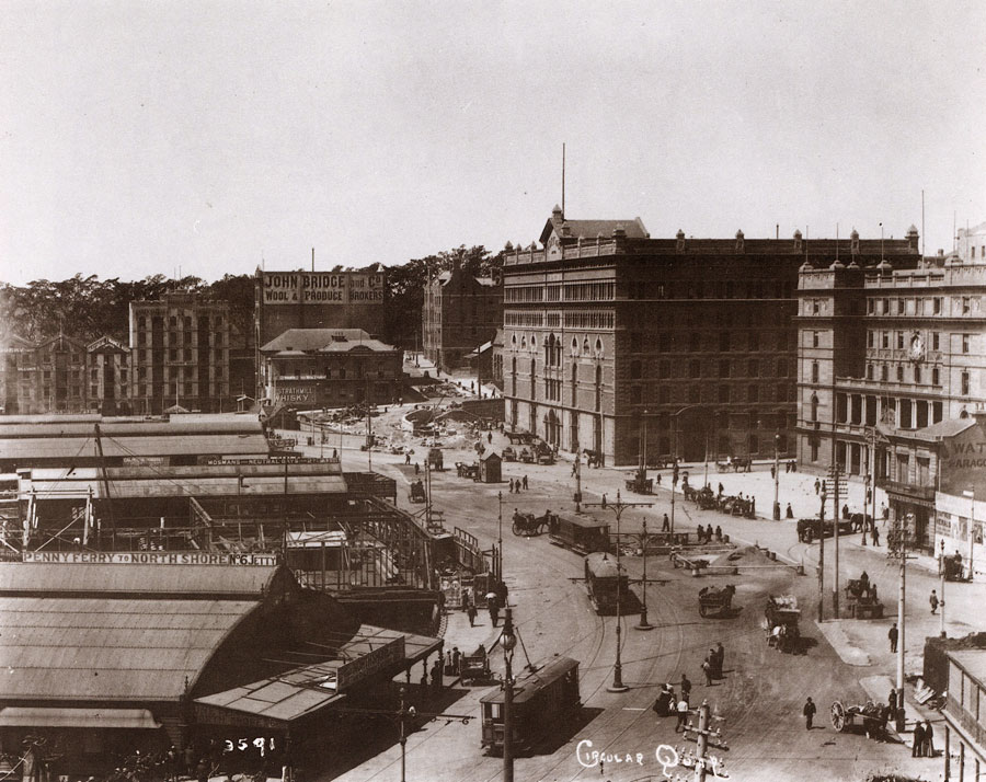 Dominating Circular Quay is Mort and Co.'s wool stores, strategically placed for the loading of wool into ships berthed alongside the Quay. This marvellous fortress-like building was demolished in 1960 to make way for the AMP's 26-storey head office, the first building to take advantage of new Council height regulations. |