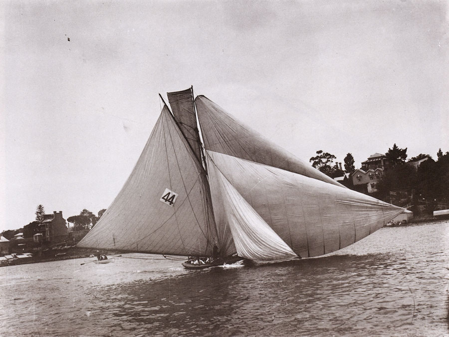 This 22-foot (6.7 m) skiff has rounded Long Nose Point, Birchgrove. The crew has gybed the spinnaker on rounding the point. The photograph dates from about 1892. |