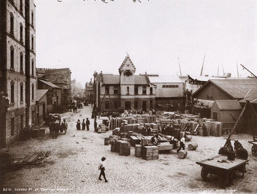 Nestling over Grafton Wharf is a delightful office block, No.1 Sussex Street, designed by William Wardell, the architect of St Patrick's Cathedral, Melbourne |