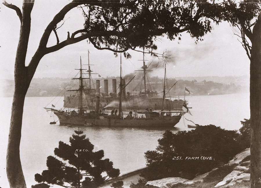 Two ships of the Australian Station at anchor in Farm Cove. The four-funnelled warship is the cruiser HMS Powerful, one of the larger vessels then afloat. Built as a long range escort for trade routes, she had a range of 11,000 kilometres at 14 knots. She was flagship of the Australian Station, 1905-1912. The smaller vessel, HMS Penguin, was a composite sloop of the Wild Swan class. She came to Sydney in 1890 as a survey vessel, being paid off in 1907. |