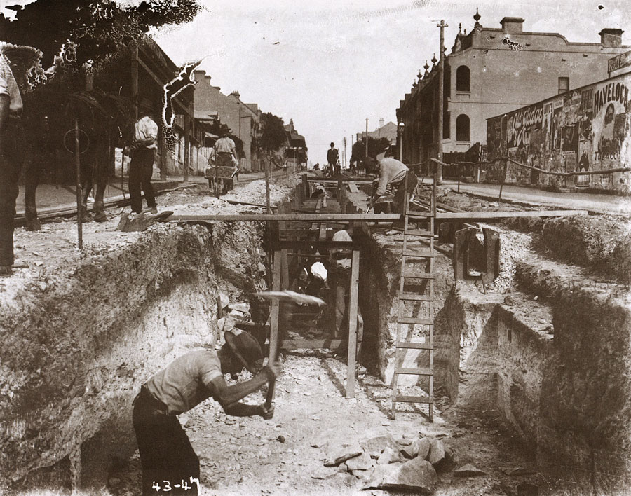 Workmen excavate the cable channel above which a dummy would run. This dummy acted as a counterweight for trams moving down the steep slope to Darling Street Wharf. Photographs of labourers working are rare in an age when scenic views and portraits were considered the only proper subjects for the photographer. |