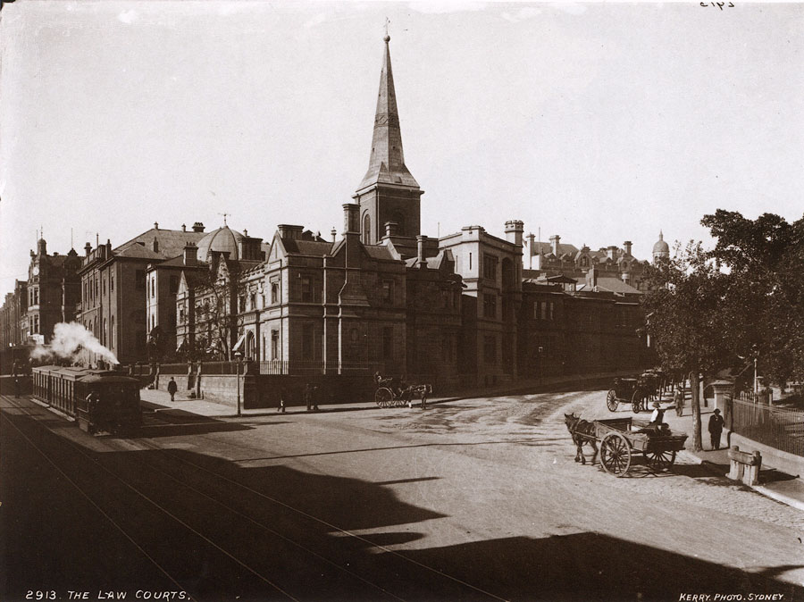 Passing the old Supreme Court building and the Tudor Revival Registrar-General's Office, is steam tram no. 97 and its 70-passenger trailing car. The Baldwin Locomotive Works in Philadelphia manufactured these steam trams, which ran on the City-Paddington-Bondi Junction route from July 1891 until 1901, when the city section of the line was electrified. |