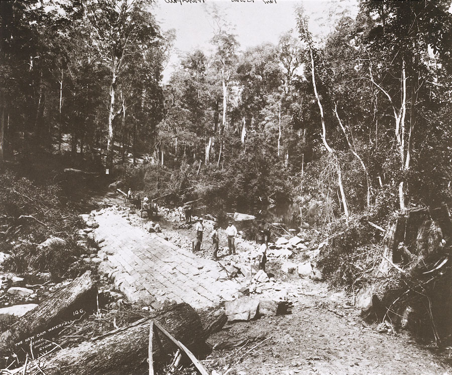 Workmen in 1895 at the southern extremity of the Royal National Park are seen here laying a dam and ford. The notice on the tree in the middle distance advises the public that the taking of trees, ferns or plants from the Park is forbidden. |