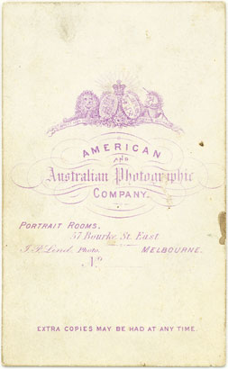 photo - web photography - photographers - australian - essays - books - collections - asia pacific photography - & much more. >>> Main Contents Page J P Lind American and Australian Photographic Company 57 Bourke Street East, Melbourne J.P. Lind worked with Merlin’s American and Australasian Photo Company. no other information available... >>> Main Contents Page photo-web / asia-pacific-photography-home / Paul's Blog / Gael's Blog / / about us SEARCH contacts - copyright notice - sharing information - permissions - other stuff