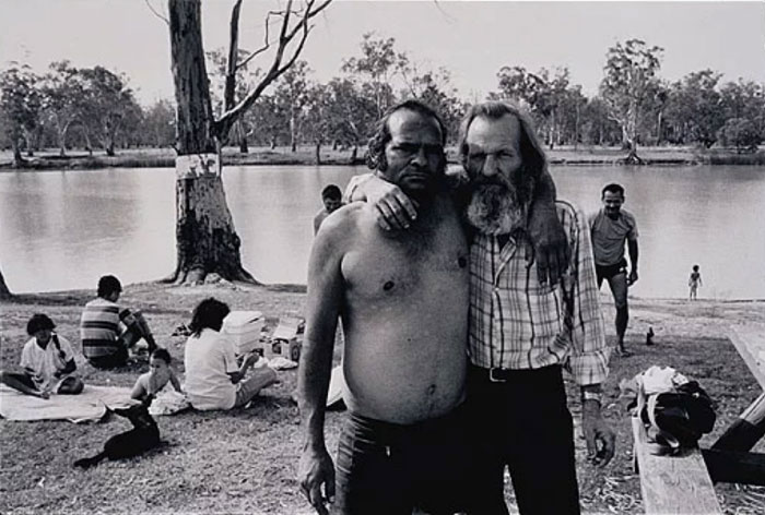 Michael Riley:  Mark Morgan and Edward Urquhart on the bank of the Murray River, Robinvale 1986