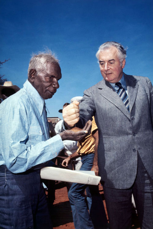 Mervyn Bishop exhibited his iconic 1975 photograph of Labor Party Prime Minister, the Hon. Gough Whitlam MP, pouring soil into the hand of Gurindji elder Vincent Lingiari, symbolising the return of land rights to the Gurindji people in the Northern Territory.