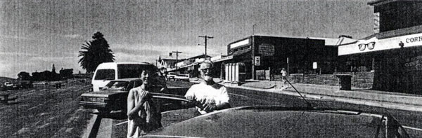 #42: Stacey, W. Narelle Perroux and Rodney Hall in Bermagui Main Street, 1987 (Travel Journal 2000, collection of Murray Cox)