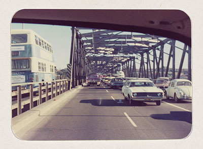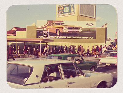 An image from the Perth Fun City folio (Fig. 31) captures a busy street scene with lanes of cars and an imposing billboard and advertising signage sandwiching a stream of pedestrians. On the other hand his image of the Gladesville Bridge (Fig. 37) from the Weekend Roads folio, with seven cars and one motorbike over six lanes, is a calming respite from the normally traffic-laden road.
