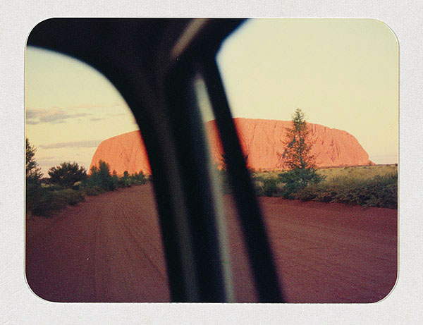 By virtue of photographing through the windscreen, Stacey's images are noticeably framed. This device is a constant reminder that these images are taken whilst travelling the road and reinforces that the essence of this photographic road trip is the road. Stacey's image of Uluru bisected by the window frame (Fig. 33) is far removed from the usual picture-postcard aspect.