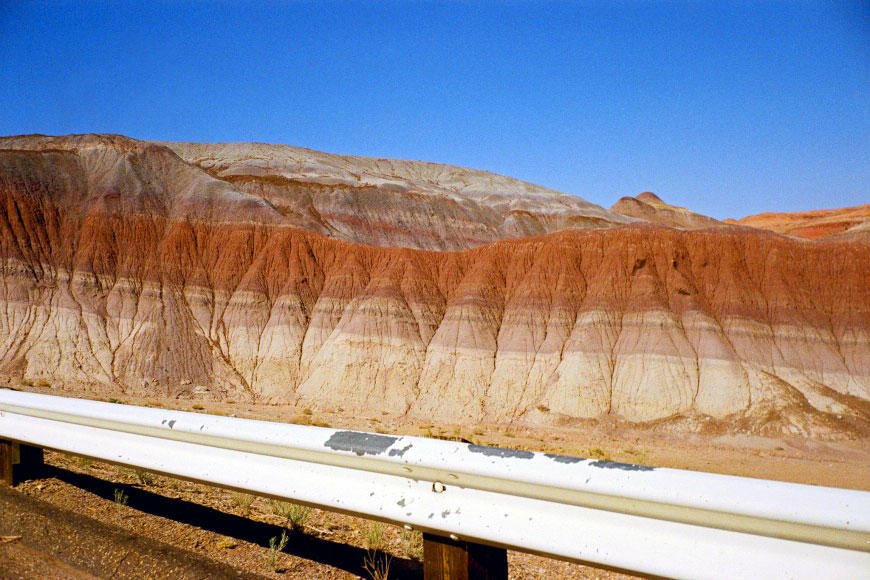 The severity of the bisection reflects the split between the spiritual and the tourism facets of the ancient monolith. Shore's images rarely highlight the fact that he is travelling by car yet he too also frames his shots in a way that assert specific meaning. Regarding U.S. 89 Arizona, June 1972 (Fig. 34), Shore