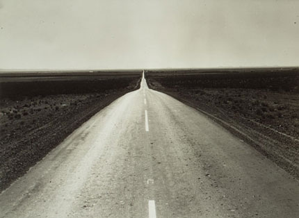 Whilst Dorothea Lange's focus was largely directed at the migrant workers, the road itself did feature as an individualised entity. One of her most striking FSA road images is The Road West (1938) (Fig. 38). This image, photographed on a stretch of U.S. 54 in Southern Mexico, is empty and endless, yet with the possibility of optimism. Many families who hoped to find work in California took the west-bound route along this highway.