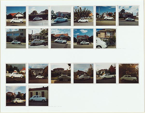 The serial nature of The Road has a precedent in Australian photography. The work of Melbourne artist Robert Rooney (b.1937) develops out of the Pop art aesthetic and relates to his urban and suburban environment often engaging with Conceptual seriality.179 His Holden Park 1&2 1970 (Fig. 47) depicts 19 polaroid images of a Holden car parked outside various dwellings.