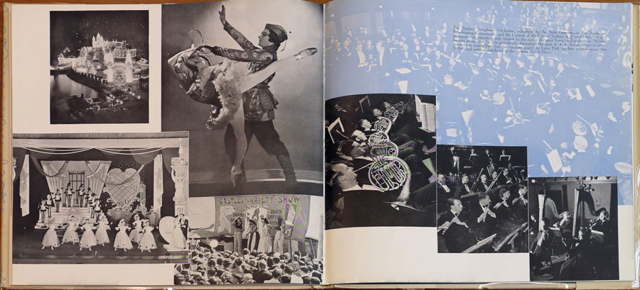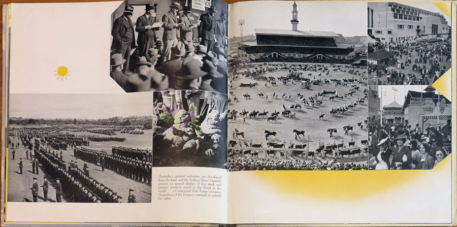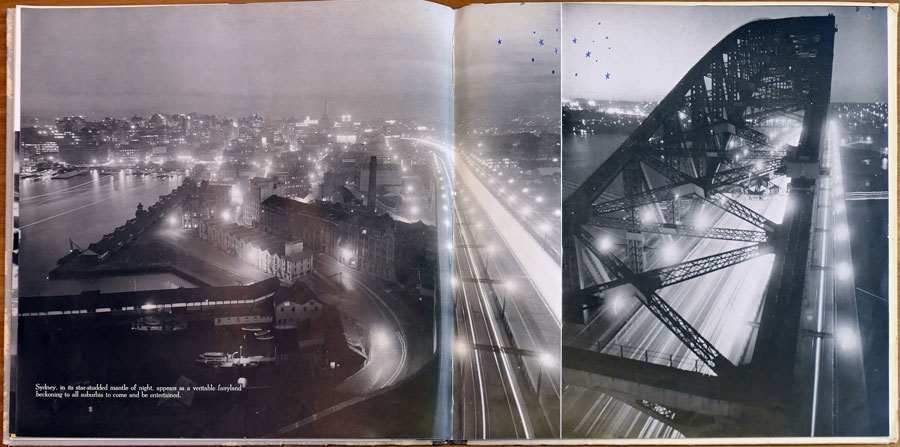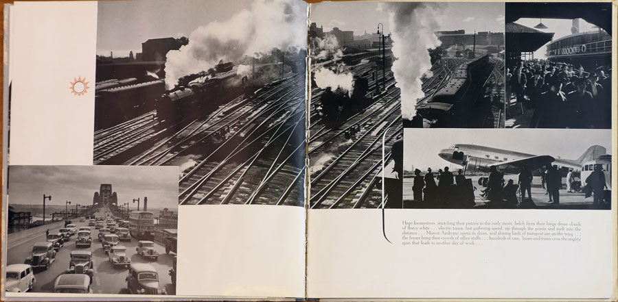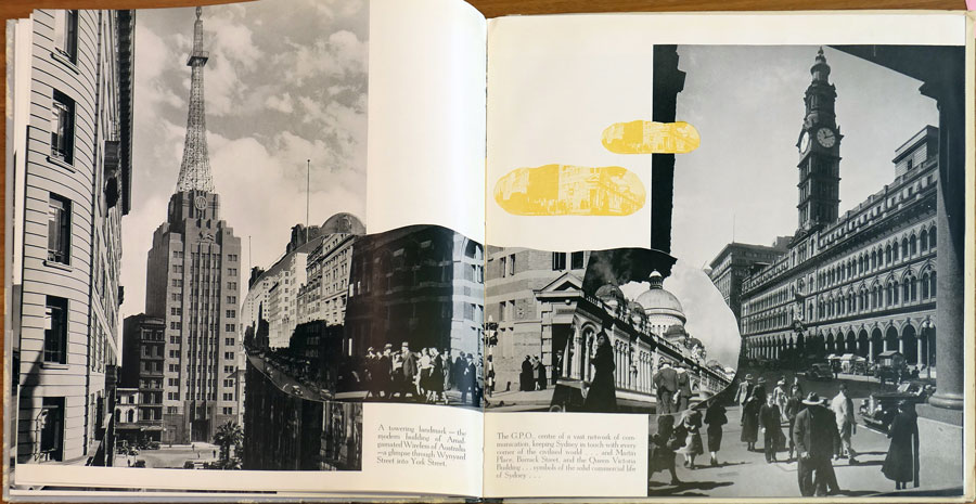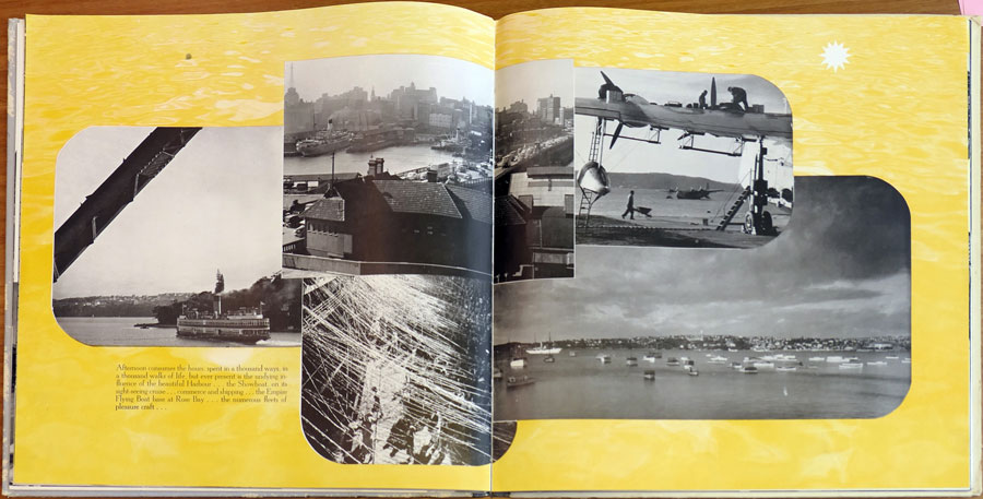 The passage of a day theme of the original edition is replaced by a historical order, the older buildings are complemented by backdrops of early painting printed in a muted blue.15 Views of modern Sydney follow, then several pages of lifestyle images follow. The busy workers of the 1940 edition are less apparent than sportspeople and picnickers.