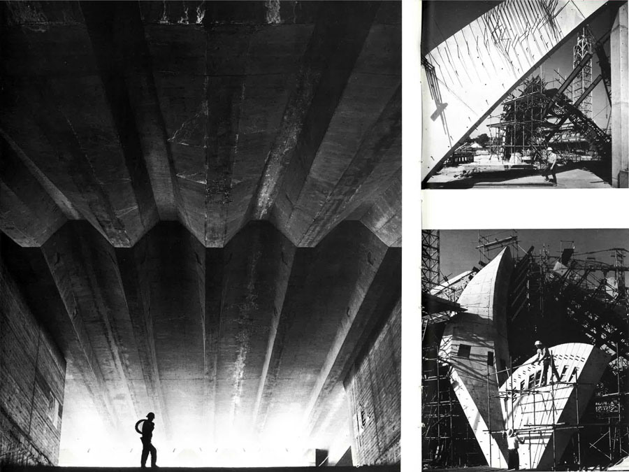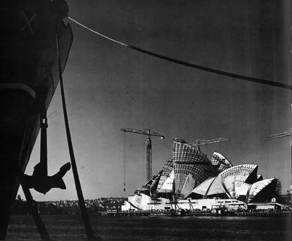 - op cit n. 44, Melbourne 1986. The same photograph as used on the cover of Sydney Builds an Opera House is reproduced on page 204 of Dupain’s anthology in which the unfinished granite walls and support cranes are visible.