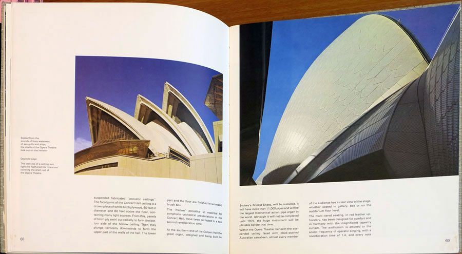 Although the text at the start of the book acknowledges these setbacks, the purpose of the book is to celebrate the architecture. The grandeur of the structure is evident at the start of the book, from the size of the site after the demolition of the Tram Depot to the murals and tapestries by John Olsen and John Coburn. The presence of workmen in many photographs establishes the scale of the buildings. The surrounding waters and low-level paths present opportunities for views of the construction which indicate the future appearance of the building to approaching visitors.