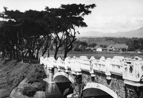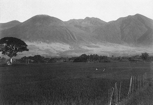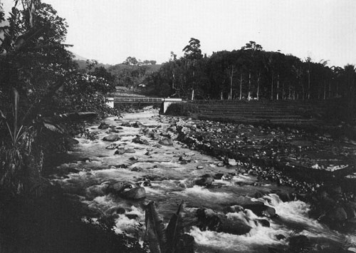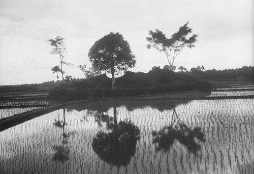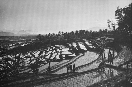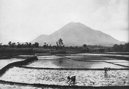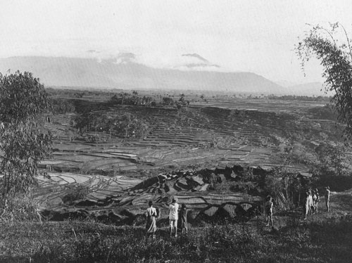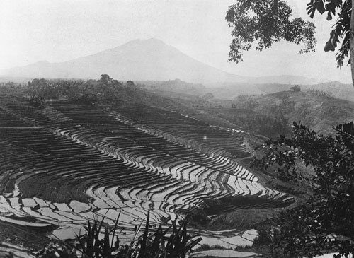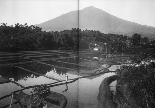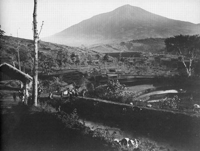 | #002: Sawahs at Tjisoeroepan. In the distance we can see the Tjikoeraj, the ruler over the landscape. The people near the typical bamboo bridge bring the image to life. |
