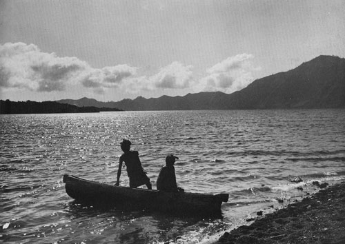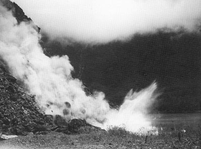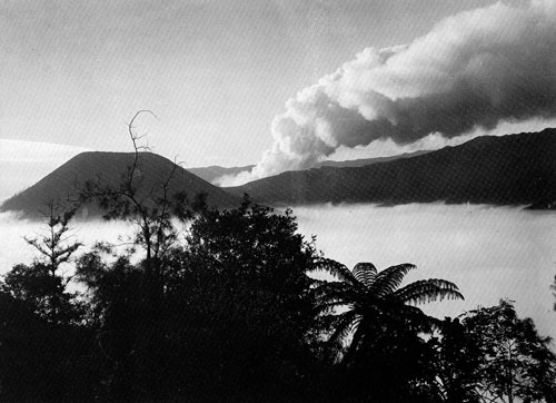 | #005: In the eruption of September 1918 glowing lava from the high lava plug flowed hissing into the crater lake of Galoenggoeng. |