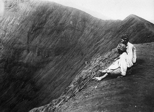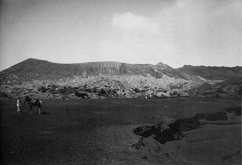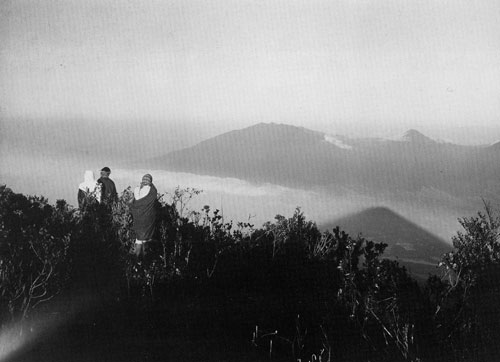 | #007: View of Papandajan and the chalk-white gaping of its enormous crater mouth. The photo was taken very early, at sunrise, from the top of Tjikoeraj, where the temperature is particularly low. The three Soendanese guides are covered in the necessary clothing and scarves. To the right, halfway up the picture: the shadow of Tjikoeraj! |