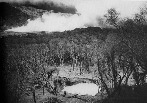 | #009: Kawah Baroe came about during the explosion of Papandajan in 1924. With very powerful explosions liquid mud and large boulders were thrown into the air by the steam eruptions. Leaves and bark were ripped from the trees. In the new (= baroe) crater all the vegetation was destroyed by sulphur steam. This steam preserved the wood, so that the trees didn’t die. The wood can neither live nor die. |