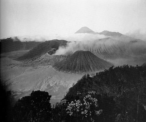 | #008: The ornamentally formed Tjikoeraj is 2,800 metres high and of the cone-shaped mountain type. Its crater which is a square kilometre in size has long ago blown out. |