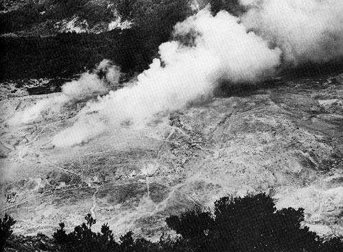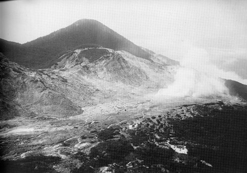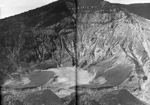 | #021:The actual crater of Papandajan: Kawah Mas. Thick white steam clouds rise from it continually. In 1924 a volcano monitoring service was established by Dr Stehn in Bandoeng, the head of volcano research. |