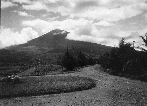 | #038: Road through Sindanglaja near the Poentjak-pass with Gedè in the background. |