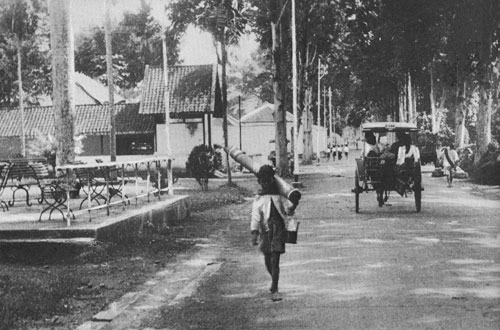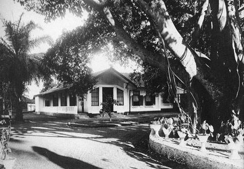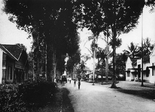 | #085: In 1922, Thilly Weissenborn took the photo below at the opening of the Garoet hospital. The recently planted trees along the road are barely visible. On the photo to the left, which I took in 1934 with my Zeiss-Ikon box camera they have grown to graceful rainforest trees. |