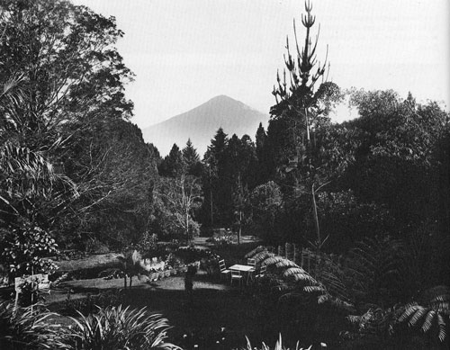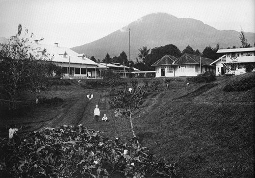 | #032: A part of Tjisoeroepan Hotel’s garden with the guest pavilions. In the background is Papandajan. |