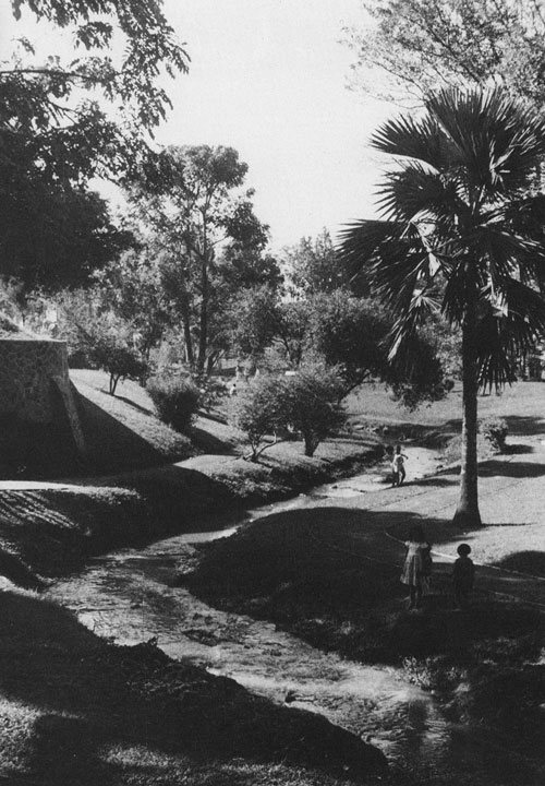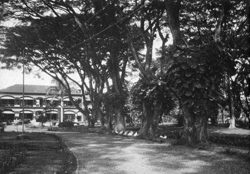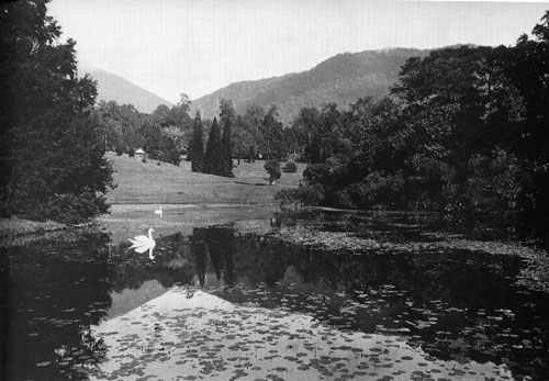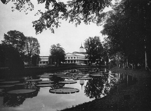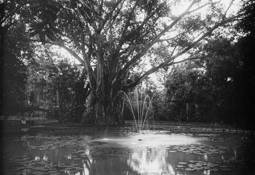 | #049: The very extensive botanical garden that was formerly the National Plant Gardens. The garden bordered on the Governor-General’s palace and is till worthwhile viewing today. The pond with the Victoria Regia water plants lies behind the palace. |