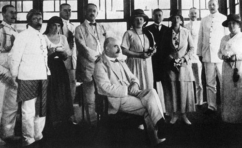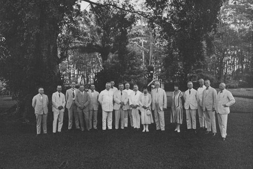 | #154: The administrators – only a few names are known to me – of the cultural enterprises of the Baud Company in 1926 on the visit of Baron and Baroness von Klitzing-Baud at the enterprise Tjioemboeleuit above Bandoeng, my place of birth. |