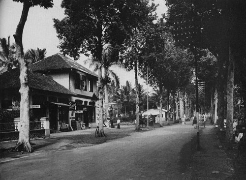 | #066: Society Street in Garoet. On the right is the club “Intra Montes”. Further along is the pharmacy, above it the studio “Lux”. On the left the office (bookstore) and reading library of Mr Van Keulen. |