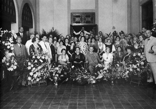 | #070: A festive gathering on 5 September 1933 in the Garoet club because of a royal medal that Administrator Van der Veen (from the cinchona enterprise Daradjat) received on his 25th jubilee. Standing in the middle Mrs Biese, since passed away unfortunately, who gave me beautiful photos for this book. In the door opening, GP Dr Rhemrev. On the far left-hand side Nico Wijnmalen and the Regent of Garoet. |