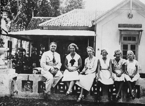 | #071: Thilly Weissenborn with the Feuilletau de Bruyn family on the wall of the Papandajan Hotel. Madame was a sister of Dr Mulder, a doctor in Garoet and founder of the sanatorium at Ngamplang. It was he who brought Thilly to Garoet as a photographer. In the background we can see the sales office of Hasan Mansoer. The photo dates from 1934. |