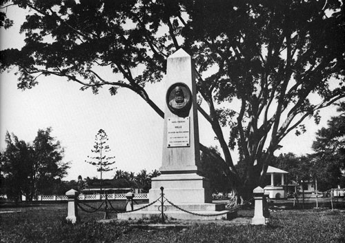 | #072: On the Garoet aloen-aloen stood the monument for Karel Frederik Holle (died at Buitenzorg in 1896), the founder of the firm Waspada located near to Garoet. Holle who was called “mitra noe tani”, the friend of the farmer, was one of the pioneers of tea cultivation in Preanger. He was initially in government service for ten years, but his interests extended most to adat and language of the population. He strongly promoted the welfare and development of the Soendanese, together with his friend Raden Hadji Mohamad Moesa in Garoet. The latter was head-panghoeloe (head of mosque personnel and business) in the regency of Limbangan and belonged to a respected Preanger family; one of his sons and grandson the Radens Soeriakartalegawa were – succeeding one another – regents of Garoet after 1915. |
