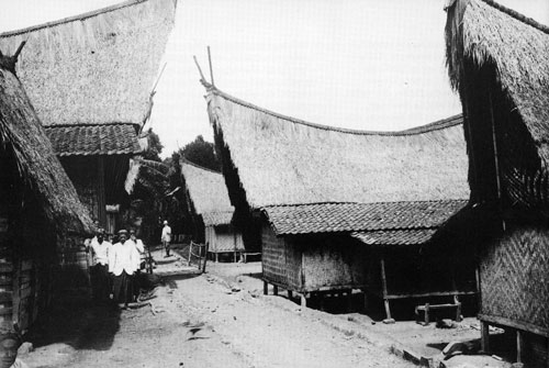 | #073: Papandak at Garoet was one of the most remarkable places in Preanger. All the houses, animal stalls and rice barns were of the same type as the Minangkabau in Sumatra. The residences even had a women’s section and were divided symmetrically. Around 1935 Papandak was destroyed by fire. |