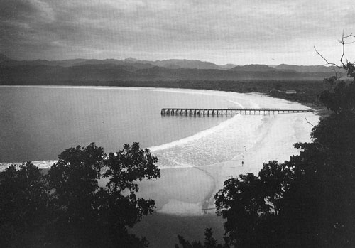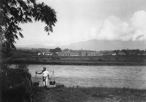 | #087: Another view of the hospital, this time across the Tjimanoek, with Goentoer in the clouds. The man in the foreground has gathered stones from the river and is transporting them in sturdy woven bamboo baskets. |