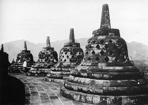 | #089: Bell-shaped cupolas – stupa – on one of the galleries of Boroboedoer. In such a stupa a statue can be found. |