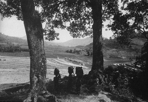 | #169: The tani ploughs his sawahs with his buffaloes. On the hill on the left lies Ngamplang. In the distance Tjikoeraj can be seen. |
