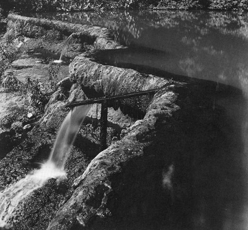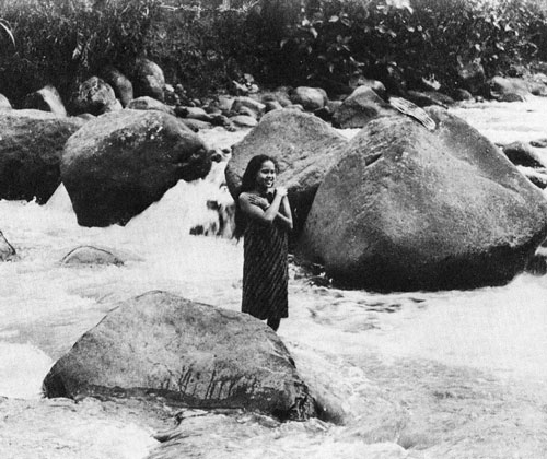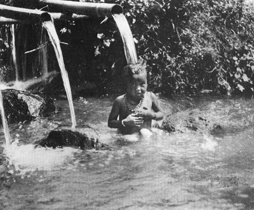 | #150: A Soendanese infant enjoys himself while bathing under a pantjoeran, a bamboo tube that serves to transport water. |