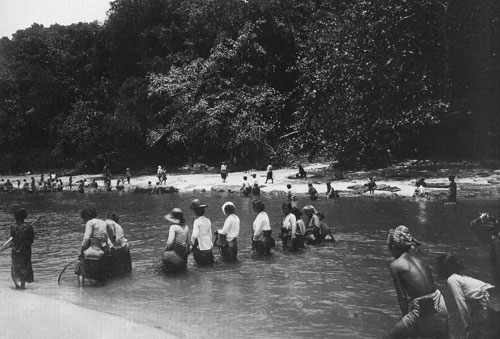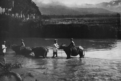 | #186: Buffaloes – these tame buffaloes are called moending – wade through the Tjimanoek with their keepers. |