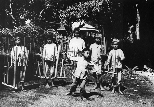 | #145: Angkloeng players in Preanger. In a bamboo frame vertical bamboo tubes are placed (each one an octave lower than the previous one), which can move to and fro in a horizontal tube. This forms the basis of the frame which is shaken. The angkloeng, an instrument that is played in West Java (primarily in Preanger) produces soft clapping tones, sing-song, dreamy, mysterious. One or two Soendanese children dance and sing. Tuned differently, depending on their size, the angkloengs accompany song and dance. The pitch is dependent on the shape, length and thickness of the tubes. |